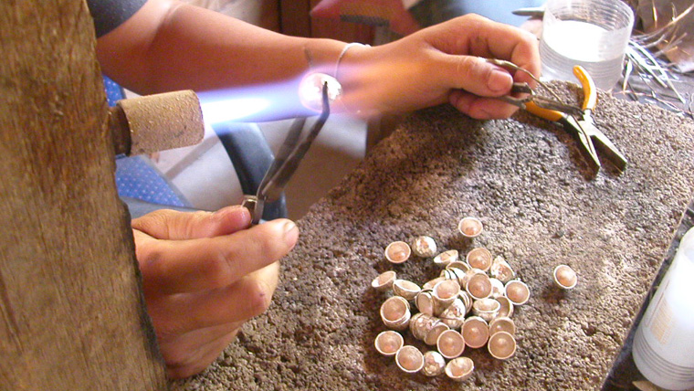 In the workshop, skilled hands melt and shape raw silver, carefully soldering, hammering, and polishing each bead or charm. The use of fire, as shown here, is a critical step — fusing elements without compromising the softness or integrity of the metal.